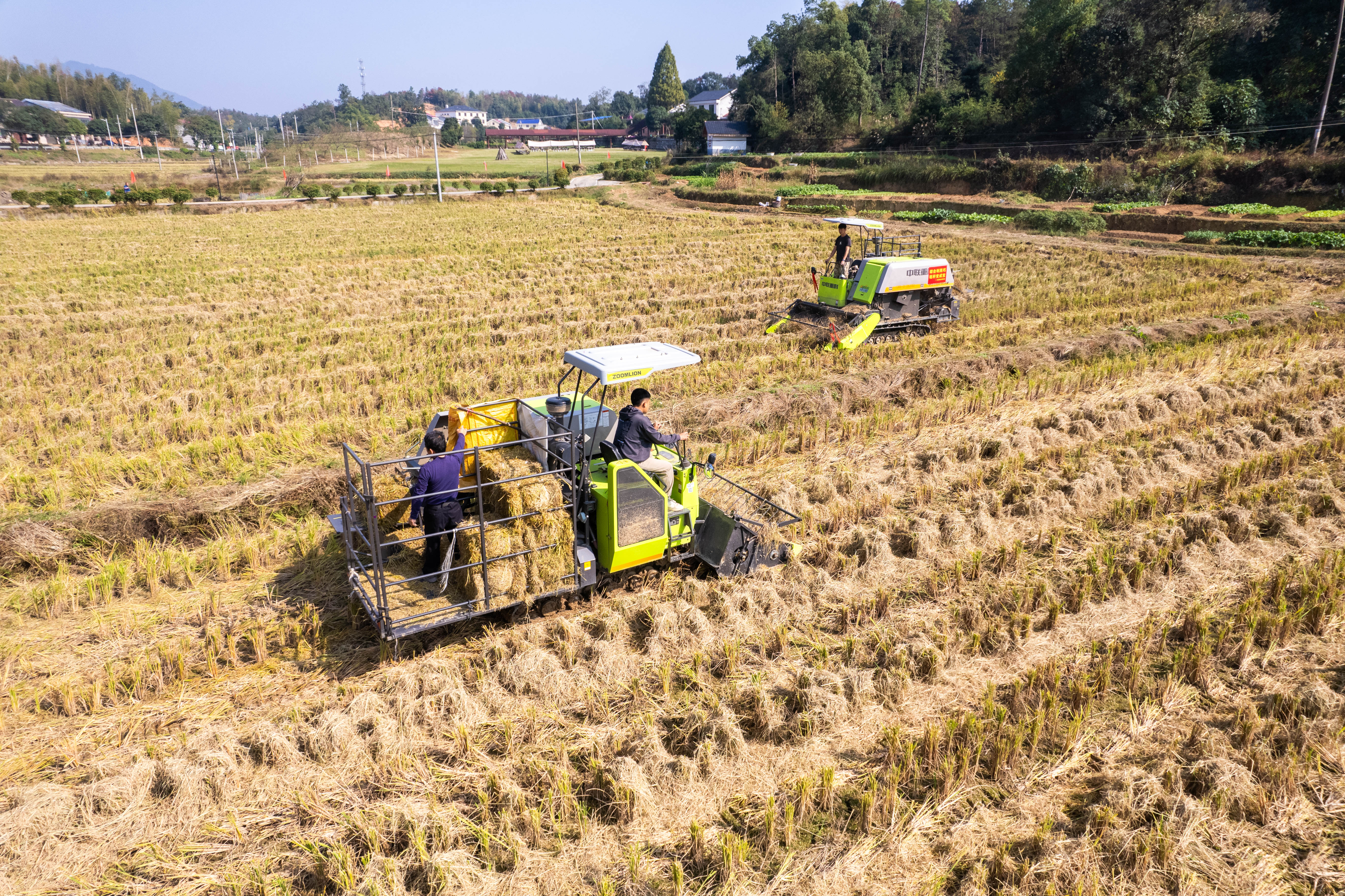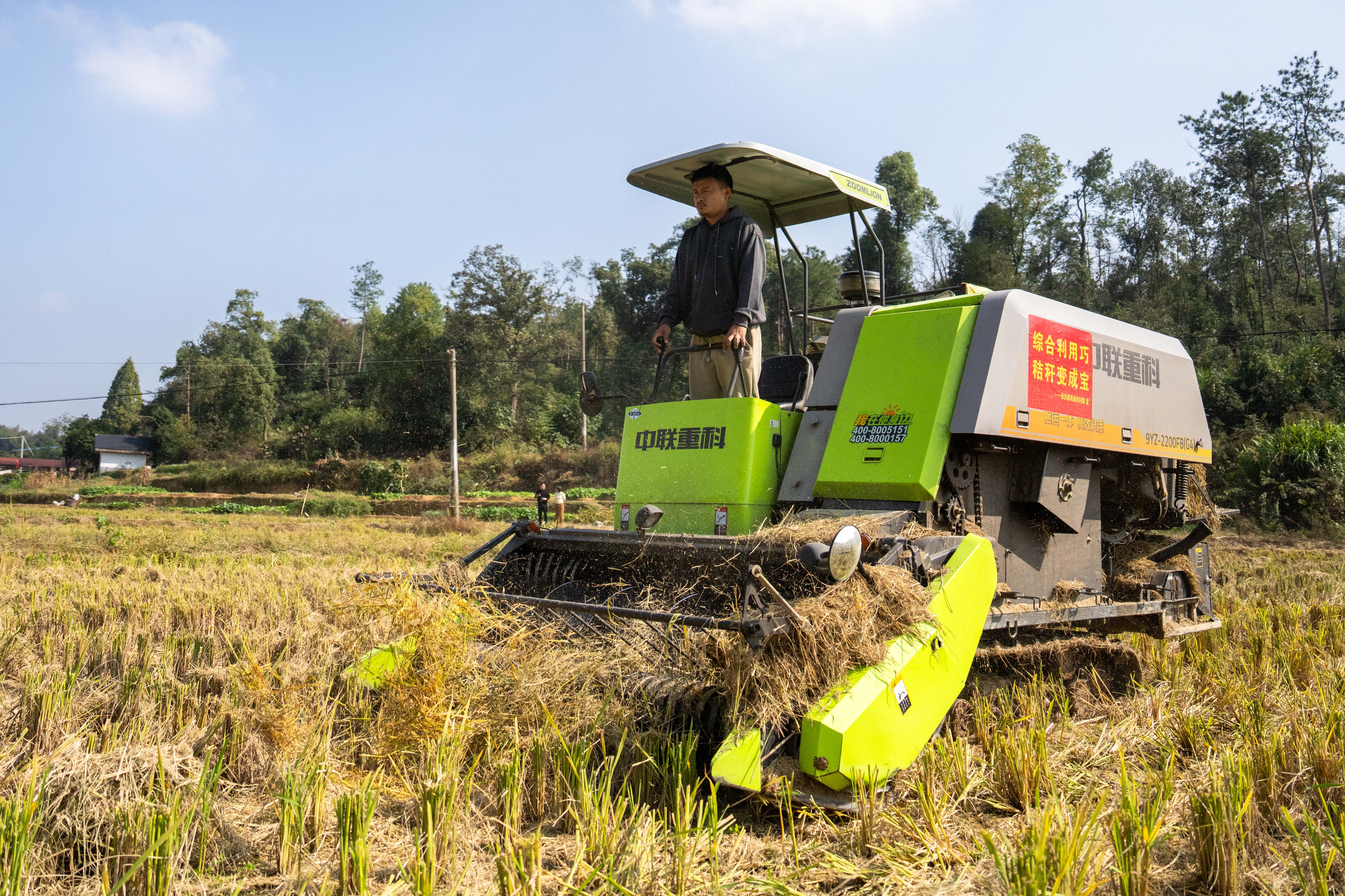 ↑ 11月5日,在长沙县开慧镇开慧村,村民操作自走式秸秆打捆机回收水稻秸秆。