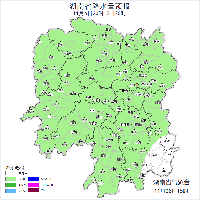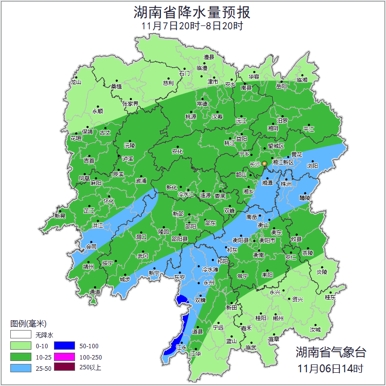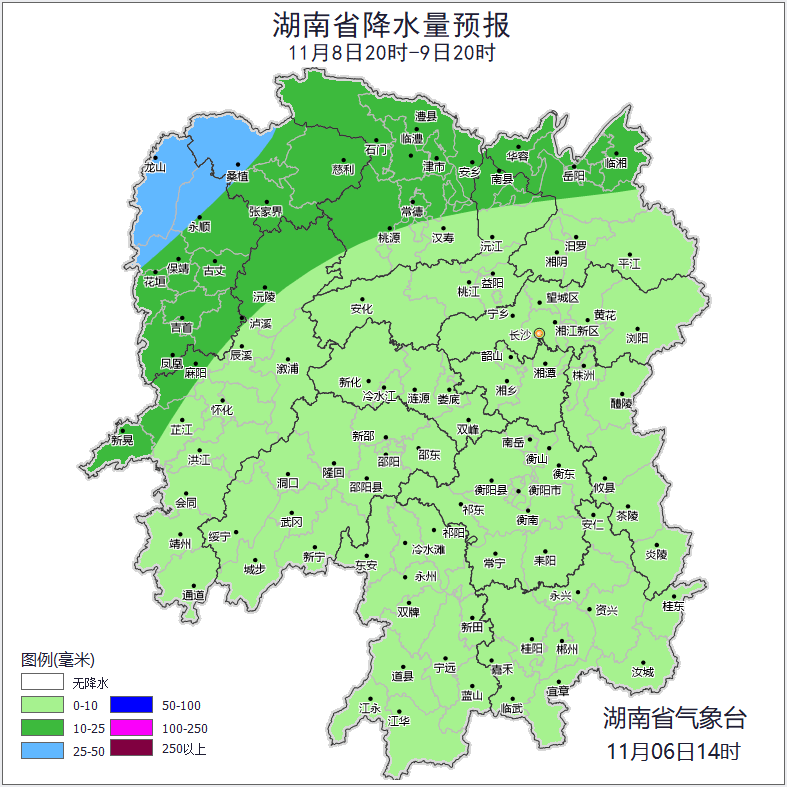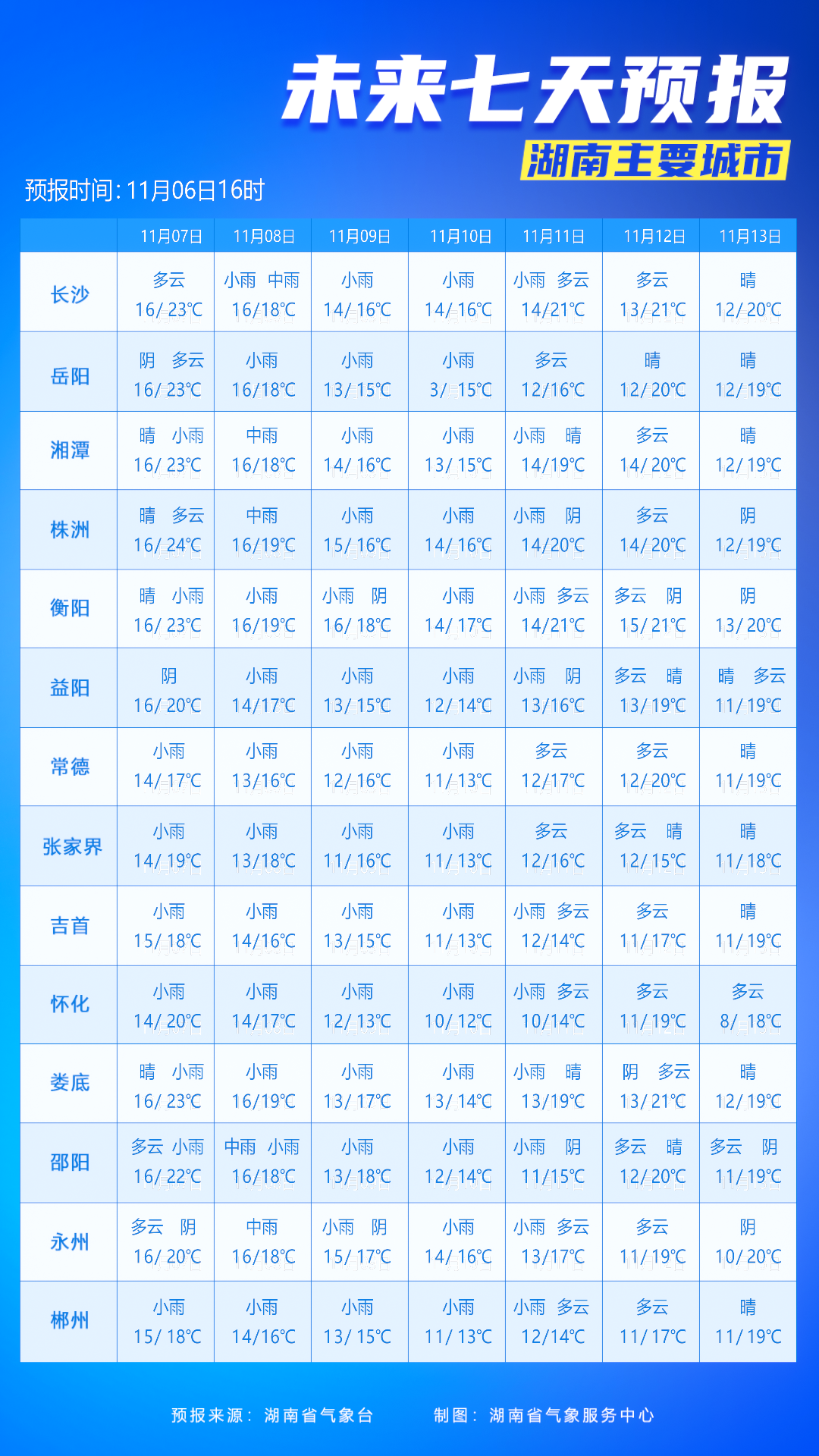 7日晚上至8日白天,全省阴天有小到中雨,其中湘中以南部分地区大雨,局地暴雨;北风2~3级;最低气温湘西北11~13℃,其他地区14~17℃;最高气温湘南19~23℃,其他地区13~18℃。