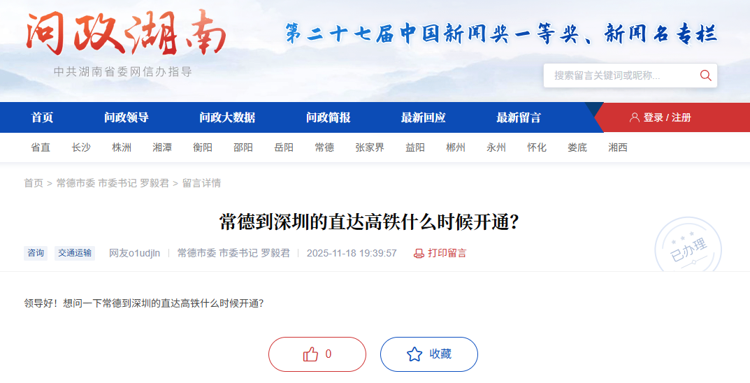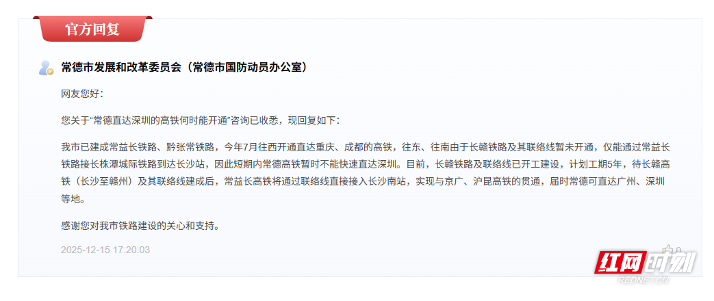 红网时刻新闻12月17日讯(记者 陈星晓)近日,有网友通过红网《问政湖南》栏目咨询常德到深圳的直达高铁何时开通一事,获得常德市发展和改革委员会正式回应。回应指出,常德目前已开通西向至重庆、成都的高铁,但因长赣铁路及相关联络线尚未建成,向东、向南方向暂时无法实现快速直达深圳。