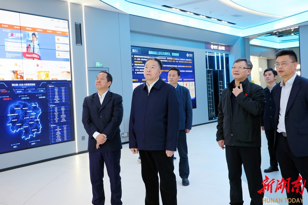 在中国联通中南研究院,毛万春一行走进湖南数字产业先行区成果展览馆,详细了解中南研究院建设发展历程以及中国联通湖南省分公司政务云、网络安全、大数据应用、人工智能场景应用等情况,并听取服务数字湖南建设情况。