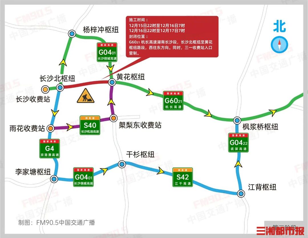 封闭位置:G6021杭长高速长沙段,长沙北枢纽至黄花枢纽路段,西往东方向。同时,三一收费站入口管制。