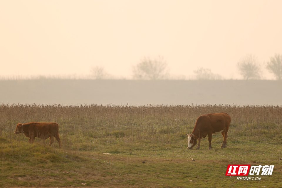 干涸的湘江中央,最近长了很多小草,老周一眼就看上了这里,他把牛赶上江滩。牛低头啃草,土黄色的江滩上,几团黑、几团棕,慢慢挪动。老周蹲在一旁抽烟,望着远处退到天边的江水。江风掠过,带走水面最后一丝反光。那些在干涸江床上活动的人,成了湘江枯水季里,最生动的注脚。
