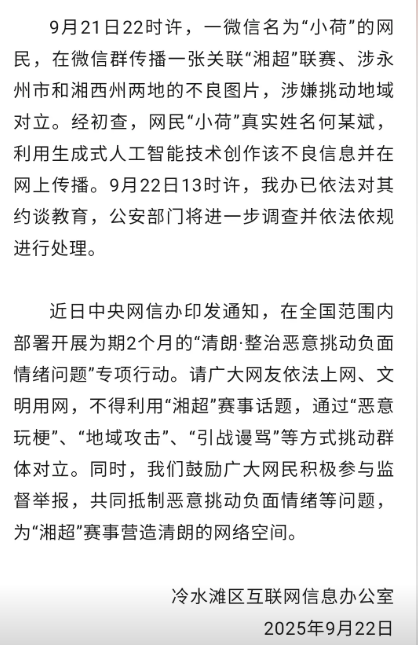 9月27日,“湘超”第三轮,湘西队客场挑战永州队,双方最终0∶0战平。但在此之前的9月22日,永州网民“小荷”就因为制作涉及两地的不良图片、挑动地域对立被约谈教育并处理。