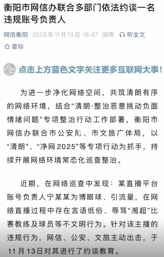11月,衡阳市在网络巡查中发现,某直播平台账号负责人宁某某为追求关注度,在直播中言语低俗、辱骂“湘超”比赛教练及球员。针对这一行为,相关部门11月13日对其进行了约谈。
