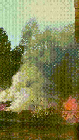 起火房屋厨房区域猛烈燃烧,滚滚浓烟裹挟着明火不断向外蹿出,房屋顶部瓦片已被全部烧毁,木质房梁随时有坍塌风险。