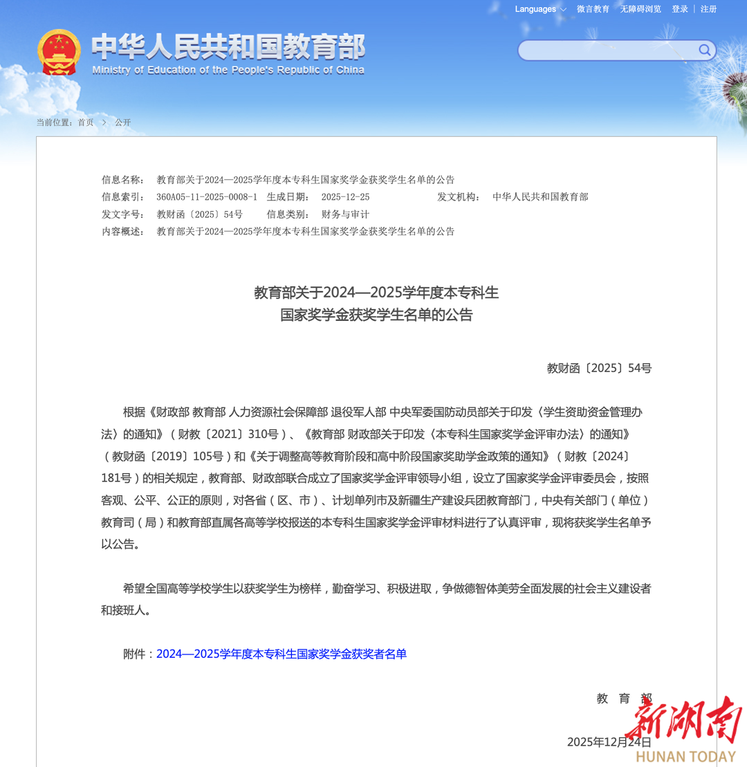 国家级荣誉揭晓!近日,教育部官网公布2024—2025学年度本专科生国家奖学金获奖学生名单,湖南共有5431名学子上榜。其中,中南大学获奖人数879名、湖南大学获奖人数555名、湖南科技大学获奖人数96名,排名全省前三。此次湖南上榜人数较去年增加105名,覆盖全省各类高校及多个学科专业,充分彰显了国家奖学金政策的公平性与普惠性。