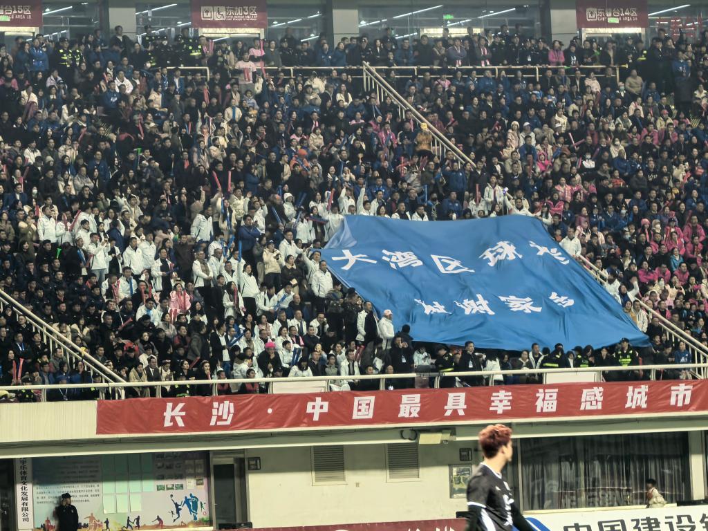 12月27日,大湾区球迷在“湘超”决赛现场打出标语。新华社记者 谭畅 摄