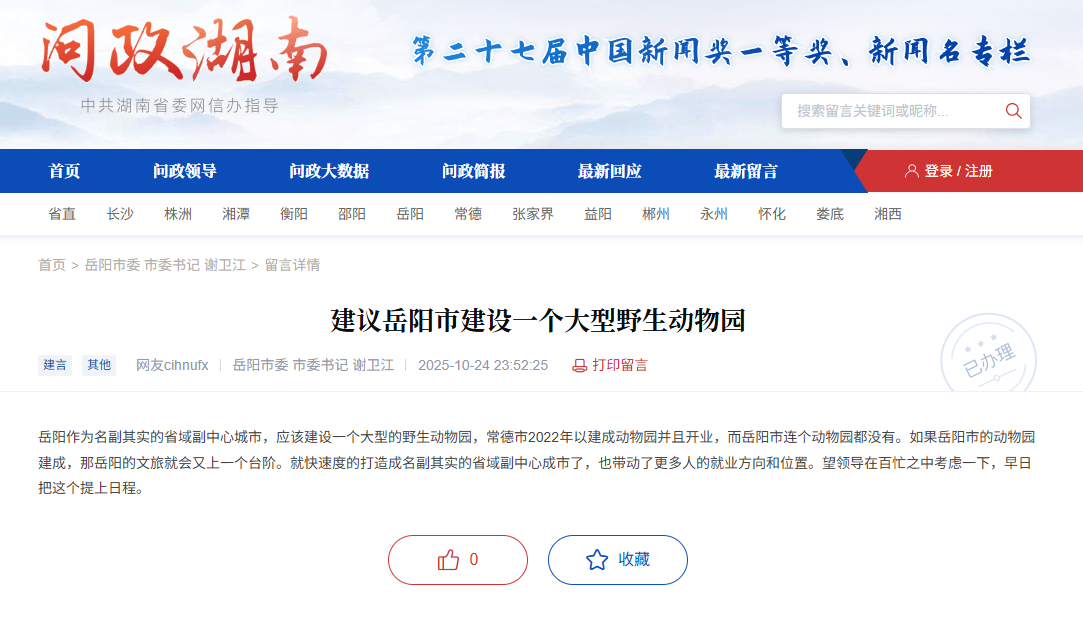 网友在建议中指出,岳阳作为省域副中心城市,目前尚无动物园,而常德等地已建成运营。建设野生动物园有望推动岳阳文旅产业再上台阶,增强城市吸引力与就业带动能力。
