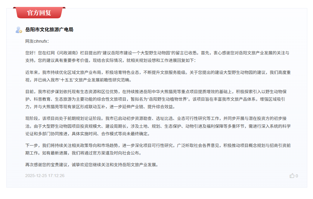 红网时刻新闻12月29日讯(记者 陈星晓)近日,有网友在红网《问政湖南》栏目留言,建议岳阳市建设一个大型野生动物园,以提升文旅竞争力、带动就业,助力省域副中心城市建设。该建议得到岳阳市文化旅游广电局的详细回应。