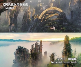 张家界国家森林公园公众号此前曾发布《阿凡达》十大取景地。具体为:袁家界景区乾坤柱,天子山景区御笔峰、仙女散花、云青岩,黄石寨景区摘星台、九重仙阁、天桥遗墩,索溪峪景区将军列队、向王观书和金鞭溪水绕四门。