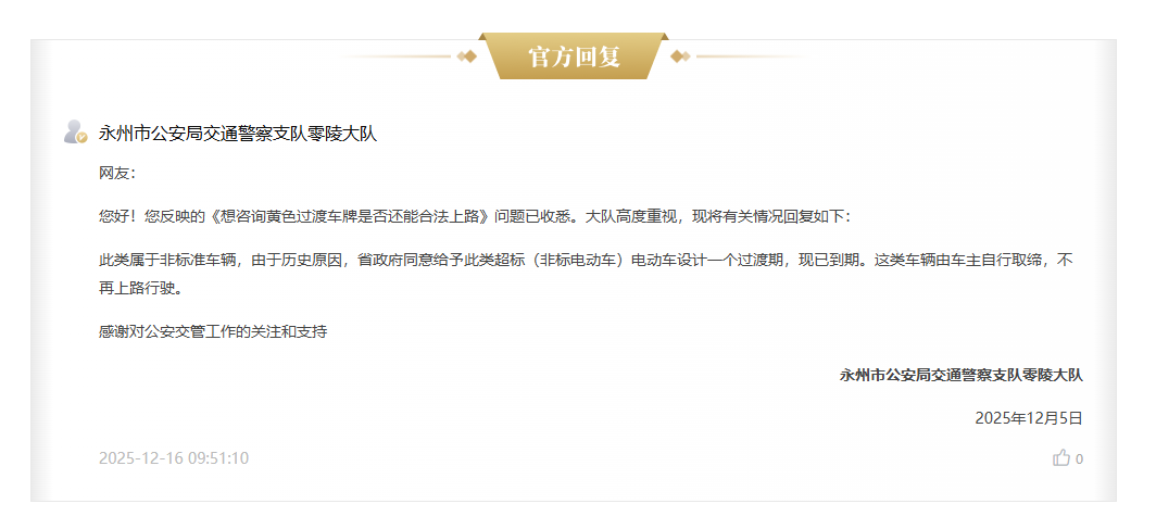 永州市公安局交通警察支队零陵大队随后对此作出回应。大队表示,网友反映的悬挂黄色过渡号牌的电动车属于“非标准车辆”。根据湖南省相关政策,此类超标(非标)电动车曾因历史原因获得一定过渡期,允许其临时上路行驶。目前,该过渡期已结束。交警部门明确,该类车辆应由车主自行取缔,不再上路行驶。