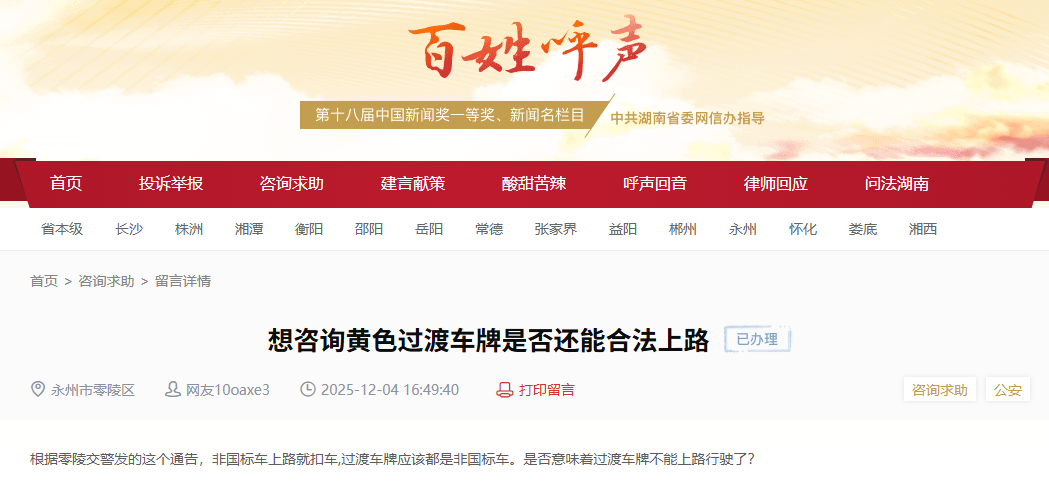 红网时刻新闻12月22日讯(记者 陈星晓)近日,有网友在红网《百姓呼声》栏目咨询“悬挂黄色过渡车牌的电动车是否还能合法上路”,反映零陵区交警部门此前发布通告,明确对“非国标车”上路将采取扣车措施,而黄色过渡车牌车辆属于非国标车,是否意味着此类车辆已不能继续上路行驶?