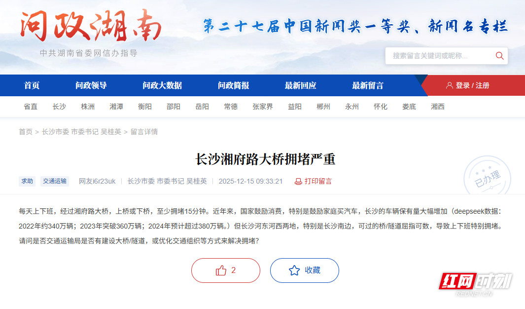 红网时刻新闻12月23日讯(记者 陈星晓)近日,有网友在红网《问政湖南》栏目反映,长沙湘府路大桥在工作日早晚高峰拥堵严重,通行车辆常常需要排队至少15分钟。网友指出,随着长沙市汽车保有量持续攀升,连接河东与河西、尤其是南部区域的过江通道数量有限,进一步加剧了跨江通勤压力,并询问是否有计划通过新建桥隧或优化交通组织等方式来缓解拥堵。