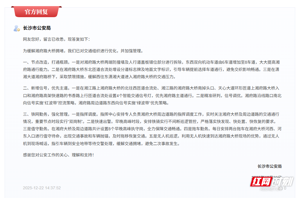对此,长沙市公安局作出公开回应,详细介绍了为缓解该路段拥堵已采取的一系列交通组织优化与管理强化措施: