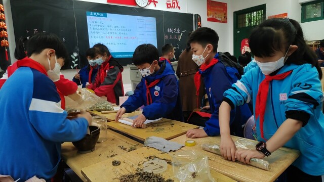 而在另外一间教室,几十个孩子正在老师指导下分组合作,有的在做艾条,有的在用檀香做香牌,大家敲敲打打、揉揉搓搓,好不热闹。