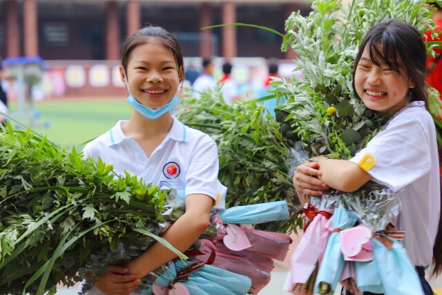“本草飘香”长廊墙壁挂满了中草药图画,“翰墨杏林”长廊展示着“中医药”主题的硬笔书法作品,这些都是学生们悉心创作的作品;校园一隅,摆放着几辆小推车,展示着孩子们亲手做的极具中医特色的扇子、香牌、书签、香囊等;而在中草药种植基地“济和园”,板蓝根、百日草等一组组中草药植株整齐排列,更是学校一道绿意盎然的好风景。
