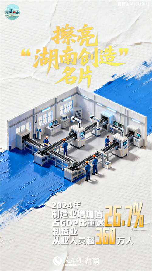 2024年,湖南制造业增加值占GDP比重达26.7%,制造业从业人员超过360万人;高效生产以分秒计算,每53秒下线一台新能源汽车、每6分钟生产一台挖掘机……在“三高四新”战略引领下,湖南巩固壮大实体经济根基,做大做强先进制造业,构建具有湖南特色的“4×4”现代化产业体系,不断擦亮“湖南创造”名片。