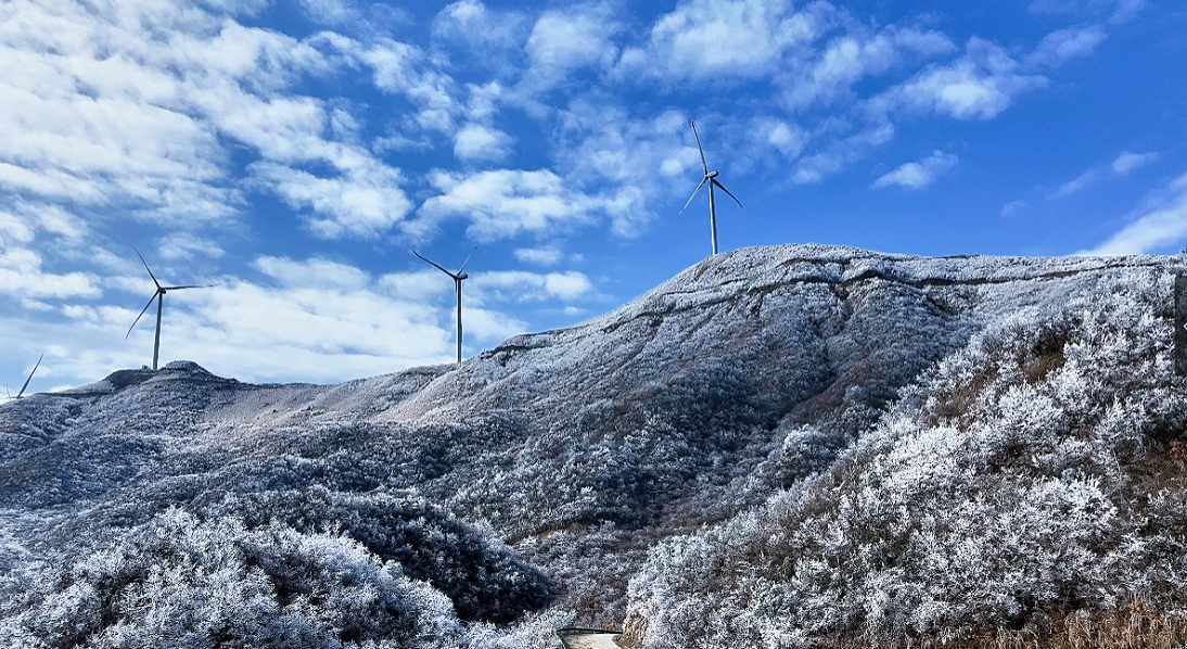 待到暖阳初升,气温回升,金色的阳光洒落山间,雾凇冰晶折射出璀璨光芒。蓝天为幕,白云作衬,银装素裹的山野愈发灵动,正应了“忽如一夜春风来,千树万树梨花开”的诗意景致。白色雾凇与转动的风车相映成趣,勾勒出瑶山冬日独有的生态画卷,让邂逅此景的游人沉醉流连。