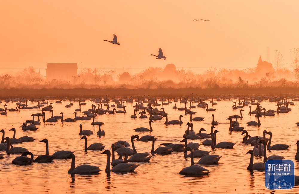 12月6日在湖南省岳阳市屈原管理区东古湖湿地拍摄的小天鹅(无人机照片)。
