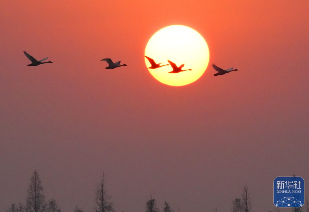 12月6日,小天鹅在湖南省岳阳市屈原管理区东古湖湿地上空飞翔。