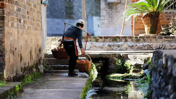 常见村民在古井旁洗衣,
