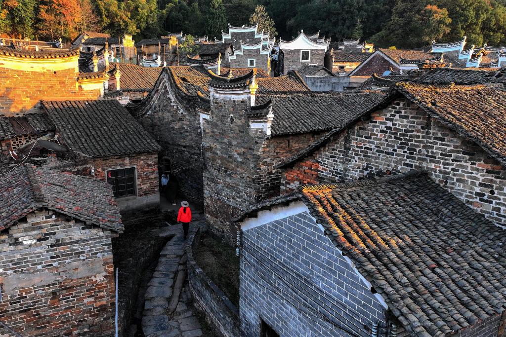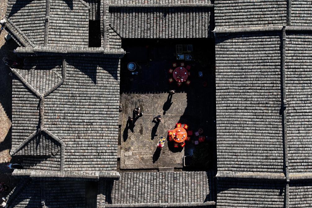 11月24日,人们在郴州汝城县金山村一处古祠堂内(无人机照片)。其中,