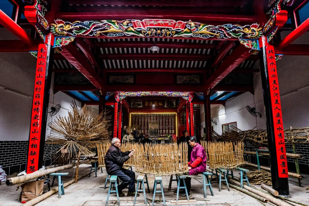 村民在郴州汝城县暖水镇北水村宗祠制作香火龙(资料照片)。