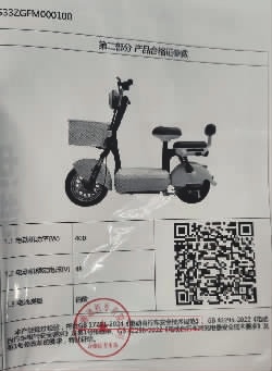 新国标电动自行车合格证。