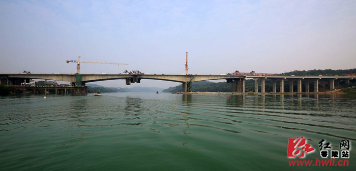 红网零陵站10月26日讯(分站记者 陈斌 汪荣军 杨情陆)10月24日下午5时20分,零陵区在萍洲大桥施工现场举行萍洲大桥主跨合龙仪式,仪式由零陵区交通运输局长朱三好主持。永州市交通运输运输局副局长欧阳佳赐,零陵区人大常委会副主任兼G322国道改线工程协调小组指挥长汤安权、零陵区人民政府副区长文锡亮,省第六工程有限公司以及设计、监理、监控和业主、施工单位等代表参加仪式。这标志着全市重点项目建设--G322国道改线工程的控制性工程萍洲大桥主体建设基本完成,为实现年内萍洲大桥建成通车打下了坚实的基础。萍洲大桥桥梁全长588.08米,桥宽28米,是国道322改线零陵段的控制性工程,总投资约1.2亿元,由中交公路规划设计院负责设计、湖南省交通建设工程监理有限公司负责监理、湖南联智桥隧技术有限公司负责监控、湖南省第六工程有限公司承建。