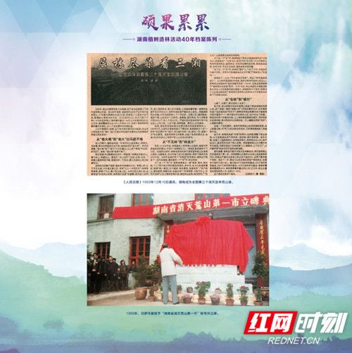 上图,《人民日报》1993年12月16日通讯,湖南成为全国第三个消灭宜林荒山省。下图,1985年,汨罗市被授予“湖南消灭荒山第一市”称号并立碑。