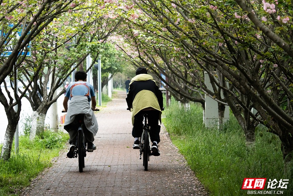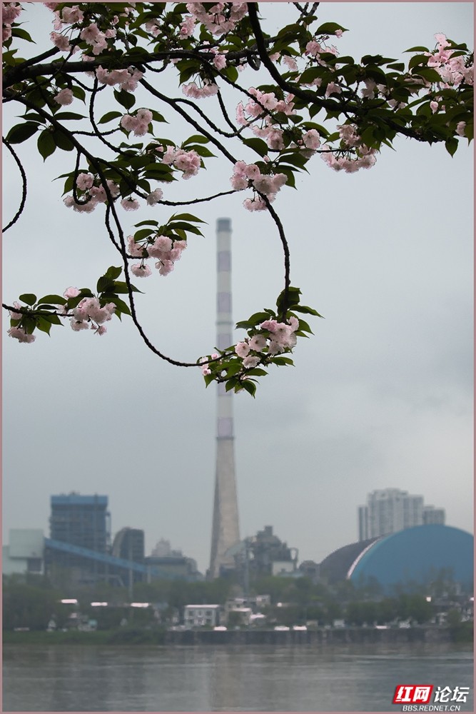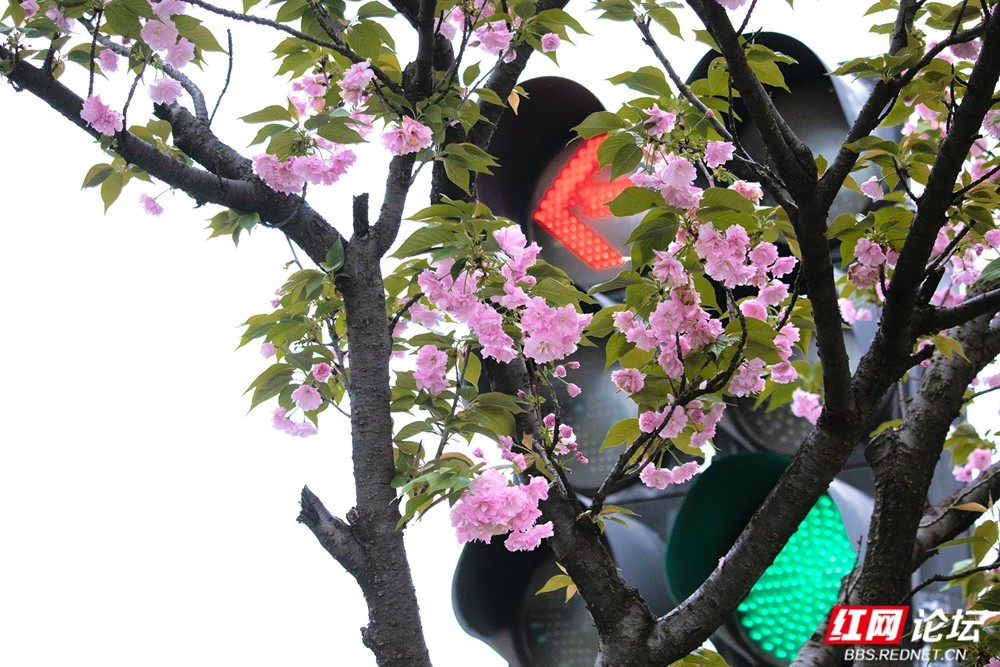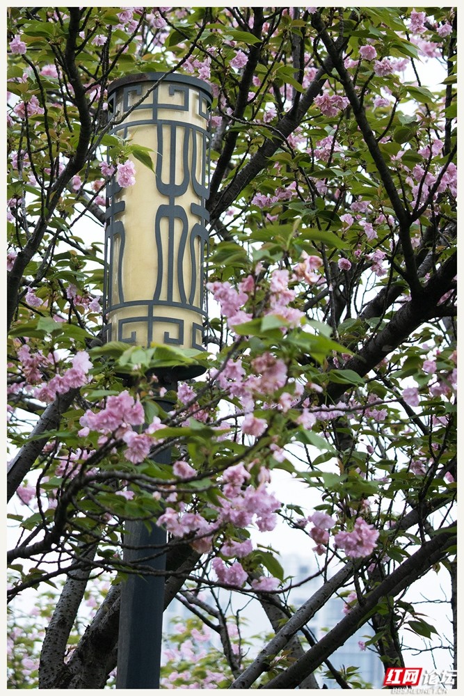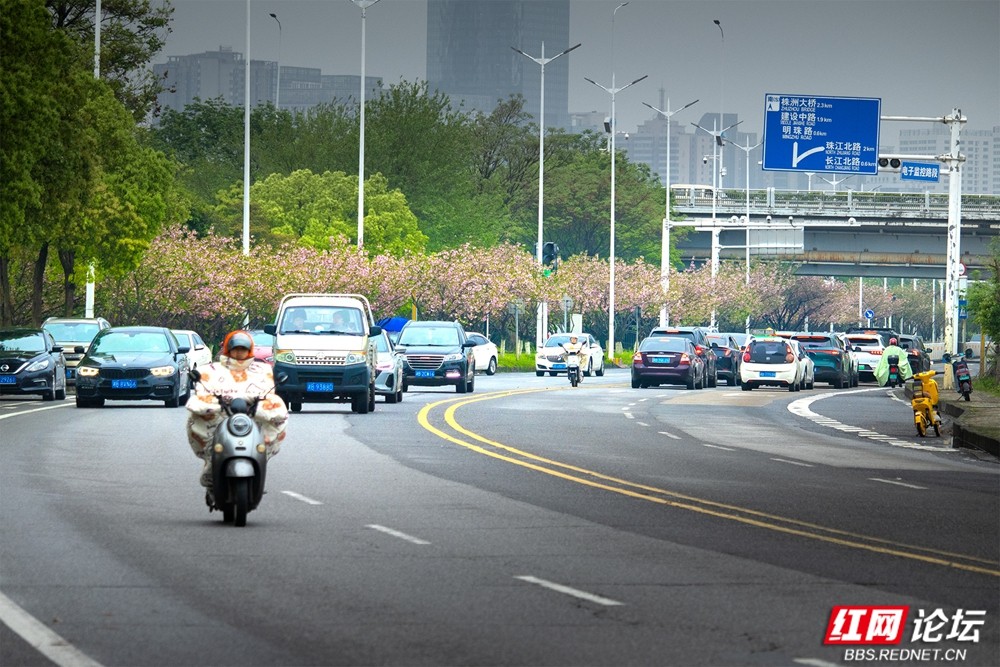 在这里,生活节奏不自觉得慢了下来。可以在樱花掩映的红色步道上,感受落英缤纷带来的诗意。看红绿灯在花影中若隐若现,或是抓拍一张花簇与远方烟囱的对比照,这种极致的烟火气最是动人。望向宽阔的湘江,看花瓣随江风起舞,烦恼也随之消散。